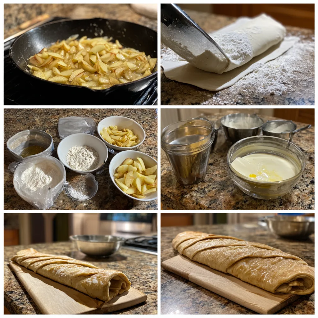 Roll out the puff pastry slightly on a lightly floured surface. Transfer to the prepared baking sheet. Spoon the cooled apple filling down the center of the pastry, leaving space along the edges.