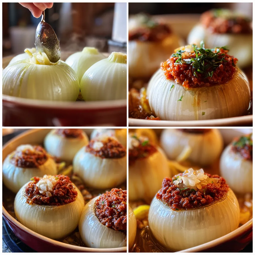Traditional Greek stuffed onions filled with a flavorful mixture of rice, herbs, and seasoned ground meat, gently baked in a lemony tomato sauce until tender.