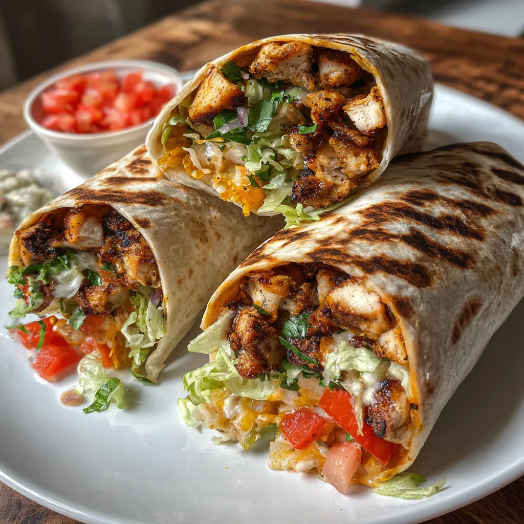 Cheesy garlic chicken wraps filled with juicy seasoned chicken, melted cheese, and a creamy garlic sauce all wrapped in warm tortillas for a quick and satisfying meal.