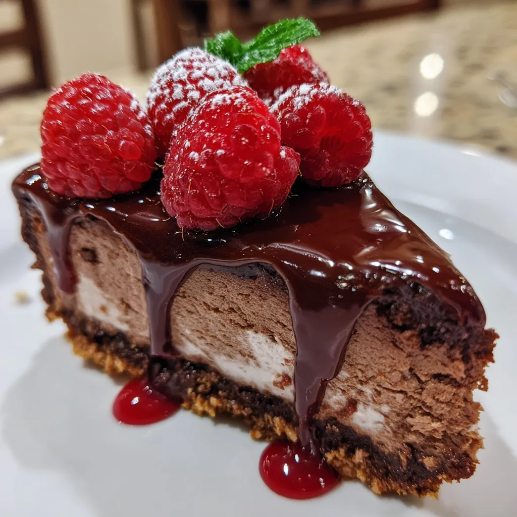 Chocolate Raspberry Mousse Cake is a decadent layered dessert featuring a rich chocolate cake base topped with a smooth chocolate mousse and bright raspberry flavor, finished with an elegant cocoa or chocolate garnish.