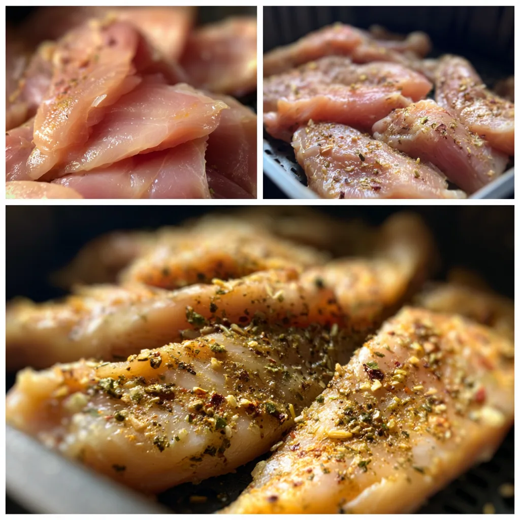 Chicken tenders are the star of the dish, offering a naturally tender and juicy cut that cooks quickly in the air fryer.