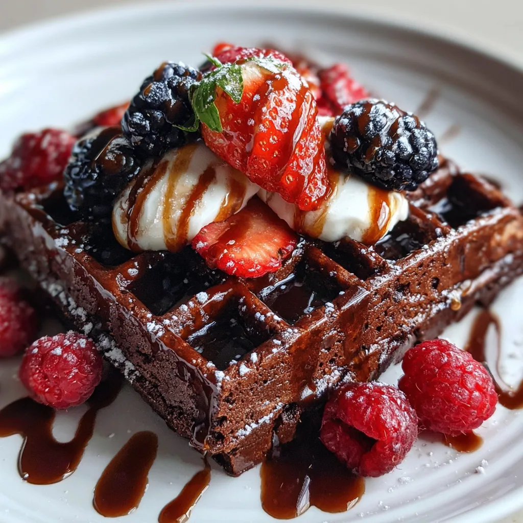 Rich, chocolatey fudgy brownie waffles with a crisp exterior and soft, gooey center. Perfect for dessert or an indulgent brunch treat, served with ice cream, berries, or a drizzle of chocolate syrup.