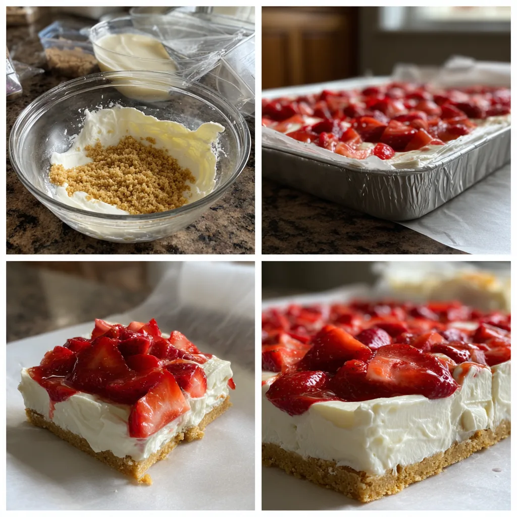 I started making these bars during warmer months when I wanted something sweet without heating up the kitchen. What I love most is how the layers come together so beautifully. The creamy cheesecake filling is smooth and rich, while the strawberry topping adds a bright, fruity flavor that balances the sweetness perfectly.