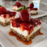 No Bake Strawberry Cheesecake Bars are a creamy layered dessert featuring a buttery graham cracker crust, smooth cheesecake filling, and a fresh strawberry topping, all made without baking.