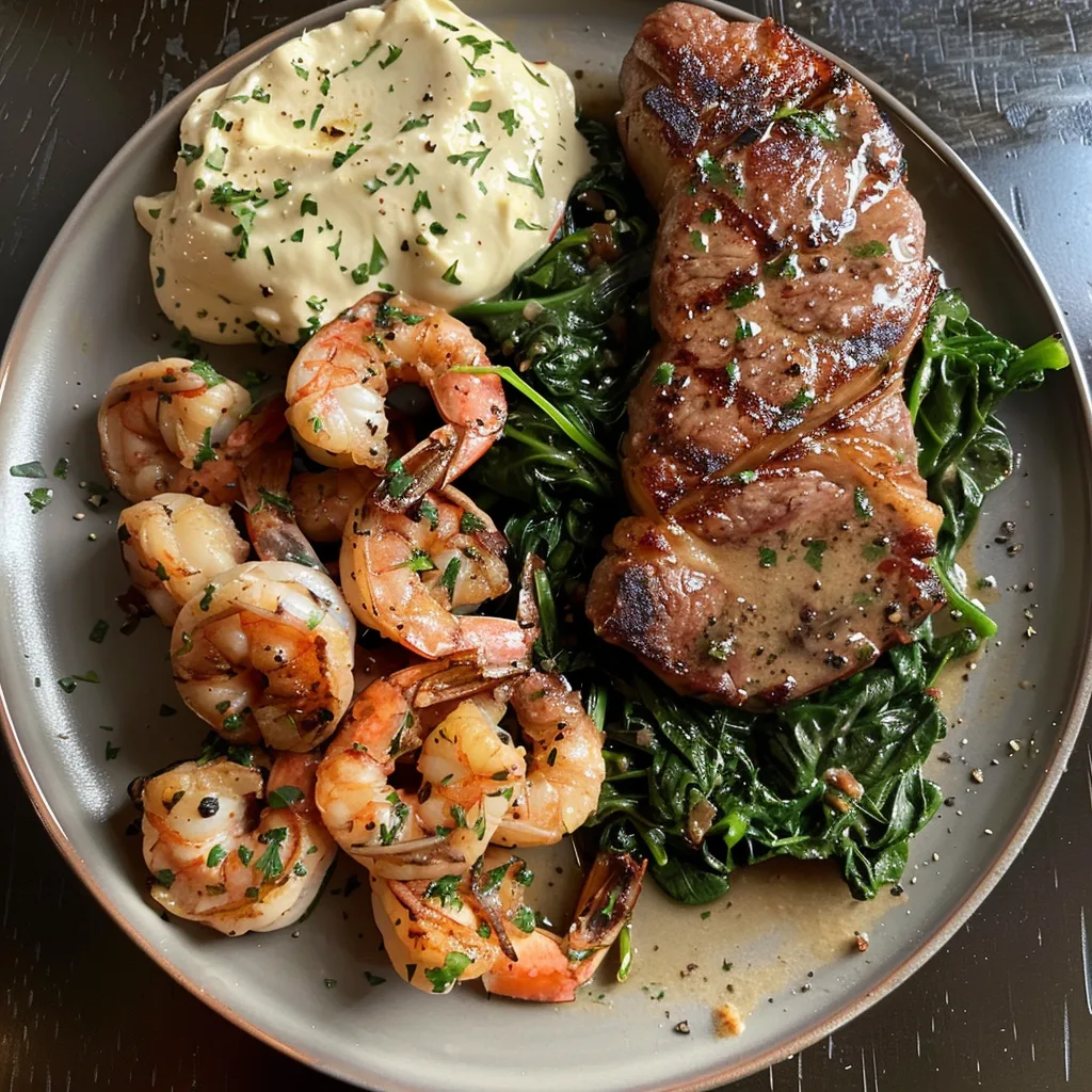 A hearty surf-and-turf dish featuring juicy pan-seared steak paired with tender shrimp in a rich, creamy garlic sauce, perfect for an indulgent dinner.