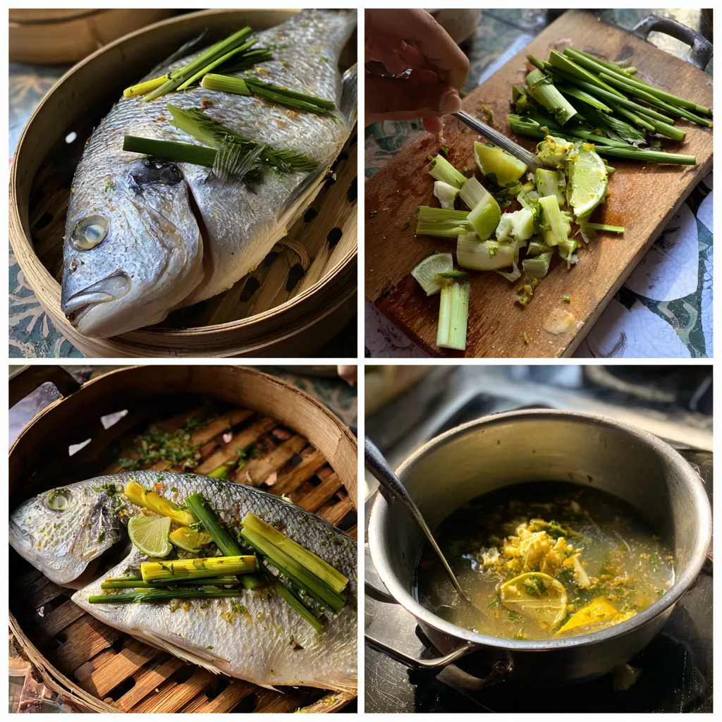 While the fish steams, prepare the sauce. In a small saucepan, combine coconut milk, bruised lemongrass stalks, fish sauce, brown sugar, ginger, and a small squeeze of lime juice. Simmer gently for 5 to 7 minutes to infuse flavors. Remove lemongrass before serving.